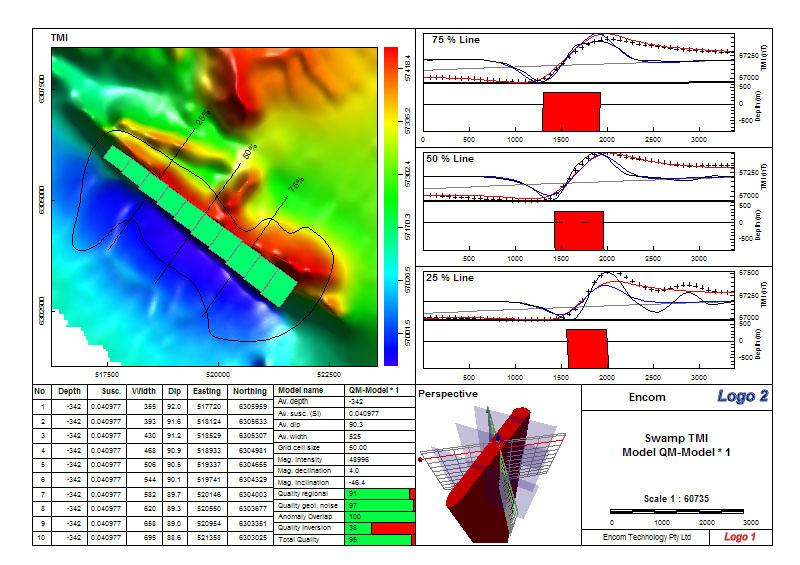 qmag1b ← Previous Next → Template displaying 2D TMI grid map w/plan view – modeled body, Body property report & Inversion quality analysis, cross-section profiles of modeled body & other features. Click on image to enlarge