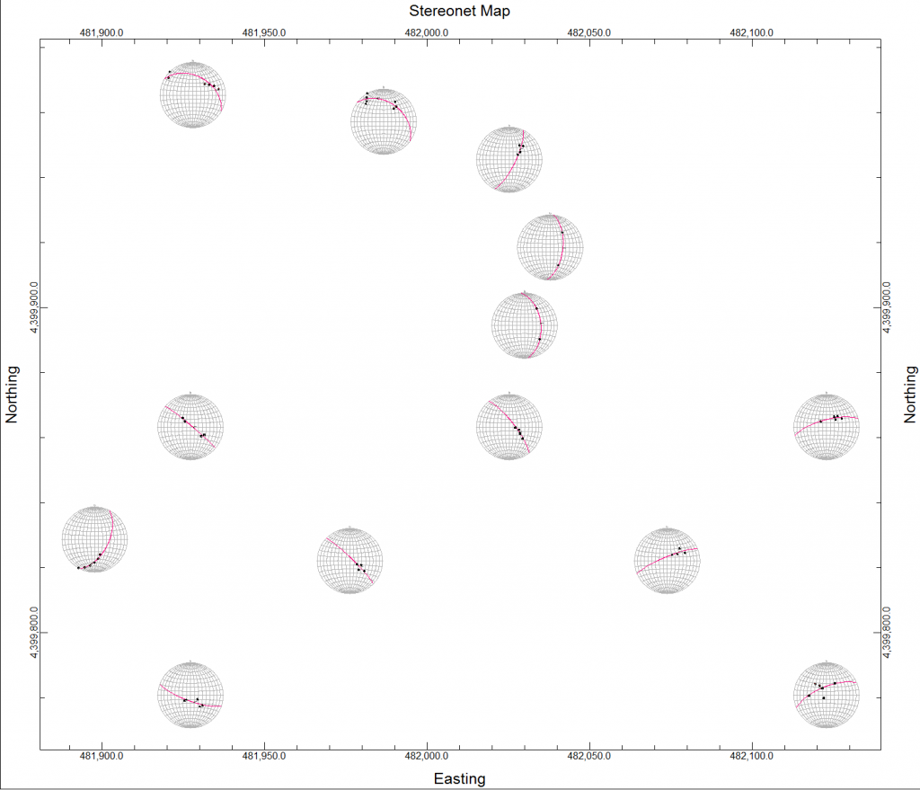 - Display project fractures as rose diagrams at sample site or borehole locations